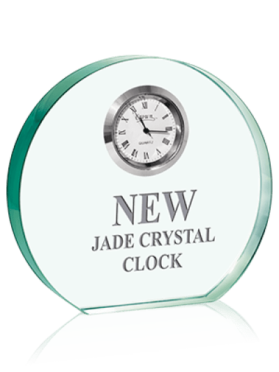 Jade Horizon 水晶鐘的圓形白色錶盤上帶有羅馬數字,整個時鐘帶有淡淡的翡翠色彩。額外的雕刻、標識和設置費用適用。